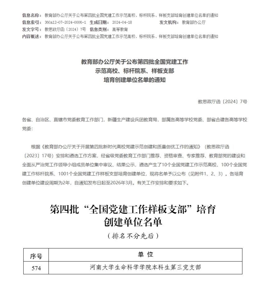 生命科学学院本科生第三党支部于2018年9月成立,依托植物科学与技术专业本科生设立,现有党员13名。近年来,在党支部工作实践和探索中,逐渐形成了“以‘七新实招’创‘七个有力’”的党建工作发展模式,以农学文化为特色,以思政引领立德树人,以支部活力为内生动力,以社会服务为外源驱力,把立德树人作为党建工作的出发点和落脚点,初步探索构建了“党建引领拔尖创新人才”的育人模式,打造了榜样导向的学生成长平台,扛牢了示范创建的主体责任,发挥了支部坚强的战斗堡垒作用,激发了学生党建工作活力。先后荣获河南省高校首批样板党支部、河南省高校先进基层党组织、河南大学首批样板党支部等荣誉。