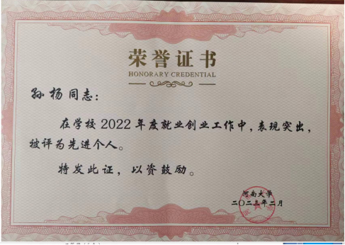 2月17日,学校在金明校区行政楼249召开河南大学2023年就业创业工作会议,对2022年度就业创业工作先进单位和先进个人进行了表彰,学院喜获“河南大学2022年度就业创业工作先进单位”,孙杨老师荣获“河南大学2022年度就业创业工作先进个人”,并作为就业创业先进个人代表上台做典型发言。