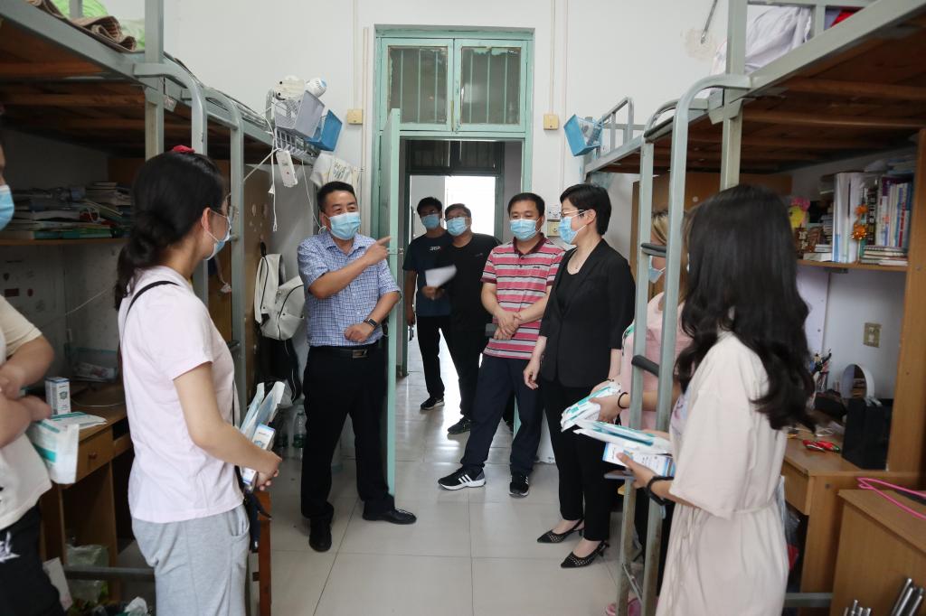 吴建伟一行来到学生宿舍向学生发放了口罩、酒精喷雾、消毒水等防疫物资,并亲切询问了学生学习、生活及家庭情况,叮嘱学生遵守疫情防控规定,定期和老师及家人联系,及时汇报在校情况。同时要合理安排作息时间,利用假期不断充实自己,提高自己。