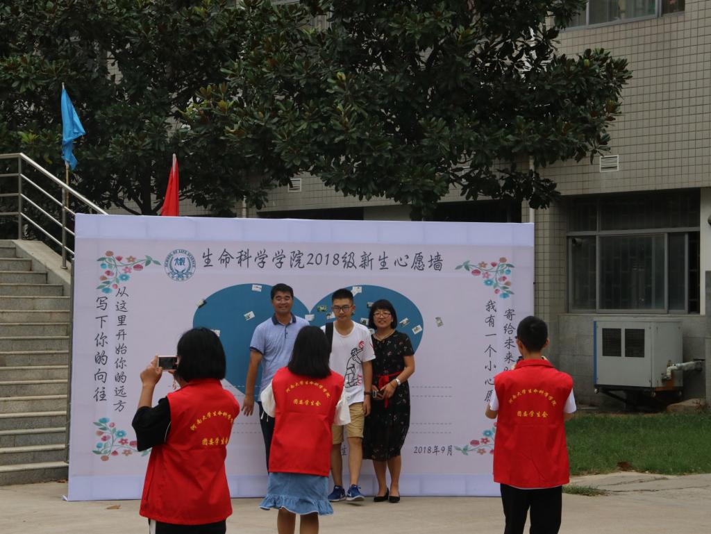 别出心裁,迎新百样。学院门口正中央摆放着由“生命科学学院时光剪影”组成的心形九宫格相框,其中,相框最上方写有“Join us!成就出彩人生!”的字样,表达了学院对于新生到来的欢迎。相框的“剪影”内容包括振奋人心的三十周年院庆晚会、严谨求真的科研时光、趣味无穷的学科竞赛、丰富多彩的学生活动等。新生站在相框后合影留念,对未知的大学生活有一种“你的过去我不曾参与,但你的未来我会陪你一起精彩”的美好向往。心形九宫格相框左边摆放有2018级新生签名墙,每一个来到生命科学学院的新生,都会在这里写下自己的名字。来大学的第一天,一笔一划书写名字,以后的每一天,一步一个脚印走过大学时光。心形九宫格相框右边摆放有2018级新生心愿墙,每一个来到生命科学学院的新生和家长都会领取到一张心愿卡,在卡片上书写对大学四年的期待与向往,憧憬与愿望。静待四年,在毕业典礼上,再由2018级辅导员亲手返还给他们,这种“时光胶囊”让同学们觉得意义无穷。生物爱好者协会在大厅中摆放了一些动物标本,栩栩如生,吸引了新生的兴趣以及让他们对未来的生活充满期待。新生在报到之后,领取一个学院定制的手提袋,里面装有一份学院手册以及以记录学院三十周年办学历程为主题内容的回忆录——《陌上柔桑破嫩芽》,这份精心定制的爱心礼袋,让新生快速了解学院的发展历程、办学现状以及学院在一流学科建设中取得的成绩。通过对一些新生和家长的采访可知,学生尊重自己的兴趣选择了生命科学学院,选择去尝试一个未知的领域,初来学院就感受到了来自学长学姐和学院的温暖,一定不负青春时光,在一流学科建设平台上努力学习、刻苦钻研,以优异的学业回报母校的培养。学院温馨的室内外环境布置、团委学生会志愿者的热情帮助、爱心水源和可口小点心等都让他们觉得这是一个友爱的大家庭,也体现了学院对于此次迎新的重视。