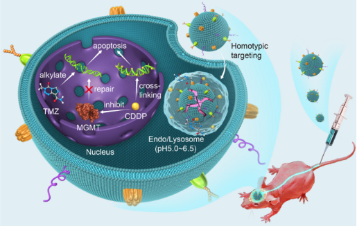 脑胶质瘤(GBM)为中枢神经系统最常见的恶性肿瘤,具有复发率高和死亡率高等特点,严重威胁着患者身心健康GBM一线药物替莫唑胺(TMZ)和广谱抗癌药物顺铂(CDDP) 的联合化疗方案,已证明在临床上能一定程度延长 GBM 患者的生存,但严重的毒副作用限制了它们的推广使用基于此实验室开发了基于癌细胞膜伪装的酸敏感仿生纳米平台共递送 TMZ  CDDP,其中 CDDP 不但能抑制肿瘤细胞增殖,同时能阻止肿瘤细胞修复,提高 TMZ 药物敏感度,最终发挥协同抗肿瘤效果细胞及体内实验结果表明该仿生纳米平台可以有效装载药物、被同源肿瘤细胞靶向识别并吞噬、在体内长循环、有效穿越血脑屏障并在脑部积累、滞留更重要的是,该仿生纳米药物在 U87MG  TMZ 耐药 U251-TR 原位荷瘤小鼠模型中均具有协同治疗效果,能显著抑制肿瘤增长并延长小鼠生存时间,且无明显毒副作用该仿生纳米药物为胶质瘤的临床化疗提供了新的思路。