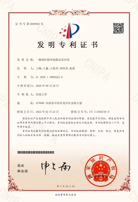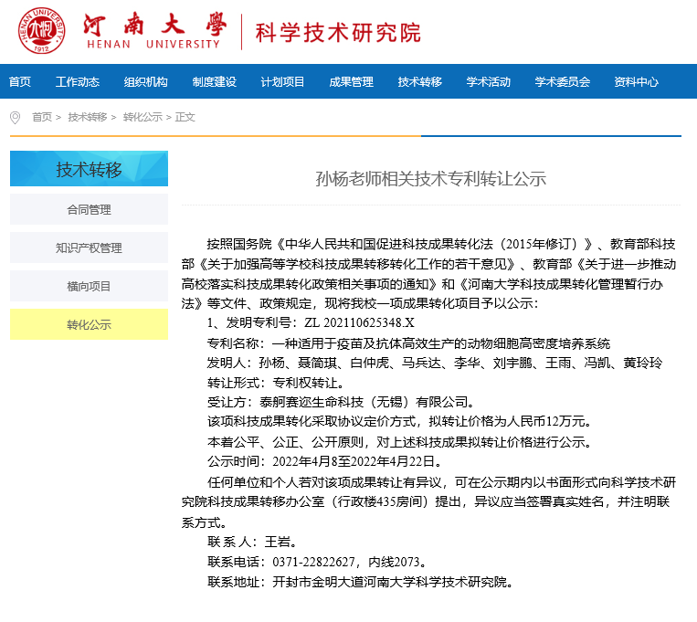 双一流建设背景下,学院高度重视应用型科技成果产出和转化工作,从制度层面建立起全方面的激励体系,收到明显的效果。近期,我院收获多项应用型科技成果。王刚老师的发明专利《一株绿针假单胞菌及其应用》(专利号:ZL 2020 1 0868222.0)于2022年02月22日获得专利授权。苏亚蕊老师的“漯麦116”于2022年3月1日获得成果认定(登记号:9412022Y0221)。孙杨老师的发明专利《一种适用于疫苗及抗体高效生产的动物细胞高密度培养系统 》(专利号:ZL 202110625348.X)的专利权拟转让给泰舸赛迩生命科技(无锡)有限公司,于2022年4月8日进入转让协议公示期。近年来,我院共实现科技成果转化13项。其中,4项技术专利已经实现产业化生产,近三年的销售收入达到1.24亿元,创造了显著的经济效益。
