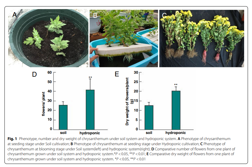 2021年11月9日, BMC Plant Biol在线发表河南大学菊花课题组的最新研究进展“Comparison of chrysanthemum flowers grown under hydroponic and soil-based systems: yield and transcriptome analysis”。