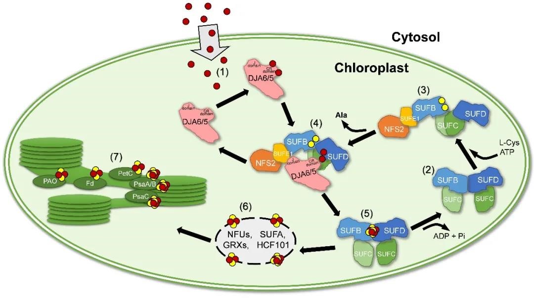 该研究通过生物信息学分析找到两个拟南芥叶绿体DnaJ-type I蛋白(DJA6和DJA5),其编码基因能够与编码叶绿体铁硫簇组装系统组分的基因共表达。研究发现,DJA6和DJA5蛋白对于植物叶绿体铁硫蛋白的成熟、光合功能的实现、叶绿体的发育、细胞内铁自稳态的维持乃至植物的生存是必需的。波谱学、质谱学以及热力学等分析方法表明,DJAs蛋白主要依赖于Cys-rich结构域中保守的CXXC基序结合铁,并且其铁结合特性的实现需要Gly/Phe-rich结构域的存在。体内体外互作研究显示,DJAs蛋白通过其J结构域与叶绿体SUF系统中半胱氨酸脱硫酶激活因子SUFE1及支架蛋白SUFBC2D复合体中SUFC蛋白相互作用,且这种蛋白间互作依赖于DJAs蛋白中铁的存在。进一步的体外组装实验证明,DJAs蛋白能够将铁传递给SUFBC2D复合体,进而完成铁硫簇的组装。此外,DJA6和DJA5在原核及真核光合生物中高度保守,其蓝藻同源蛋白SynDJA对拟南芥突变体的功能互补进一步阐述了DJAs蛋白在叶绿体铁硫簇生物合成的功能保守性。