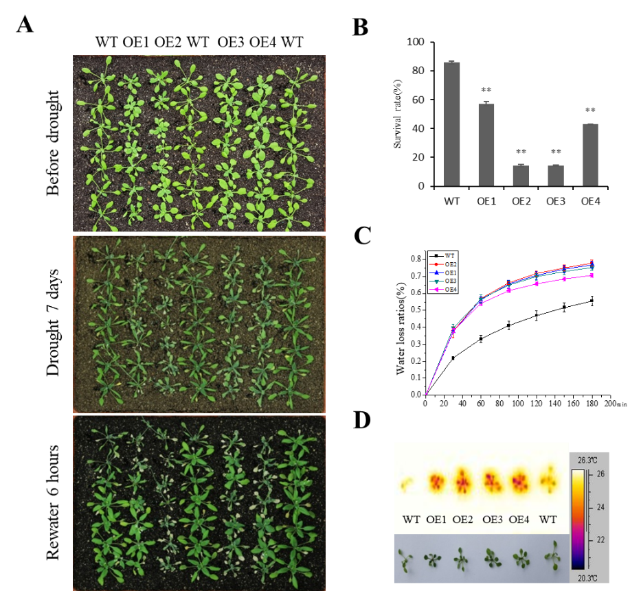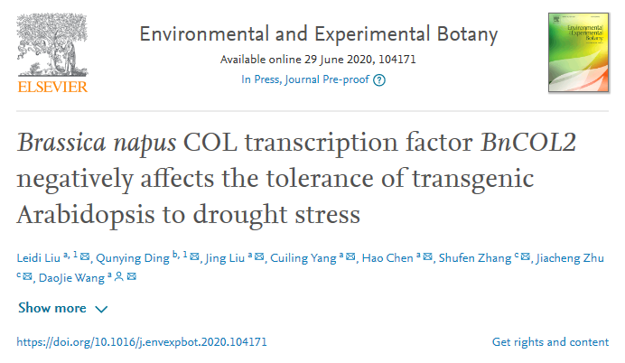 2020年6月29日,生命科学学院/省部共建作物逆境适应与改良国家重点实验室王道杰课题组在Environmental and Experimental Botany 在线发表题为“Brassica napus COL transcription factor BnCOL2 negatively affects the tolerance of transgenic Arabidopsis to drought stress”的研究论文。本研究通过对油菜FOX拟南芥库进行筛选与鉴定,得到干旱响应关键基因BnCONSTANS-LIKE2(BnCOL2),进而揭示BnCOL2可能通过影响ABA信号通路及干旱胁迫相关基因的表达负调控植物对干旱胁迫的耐受性。