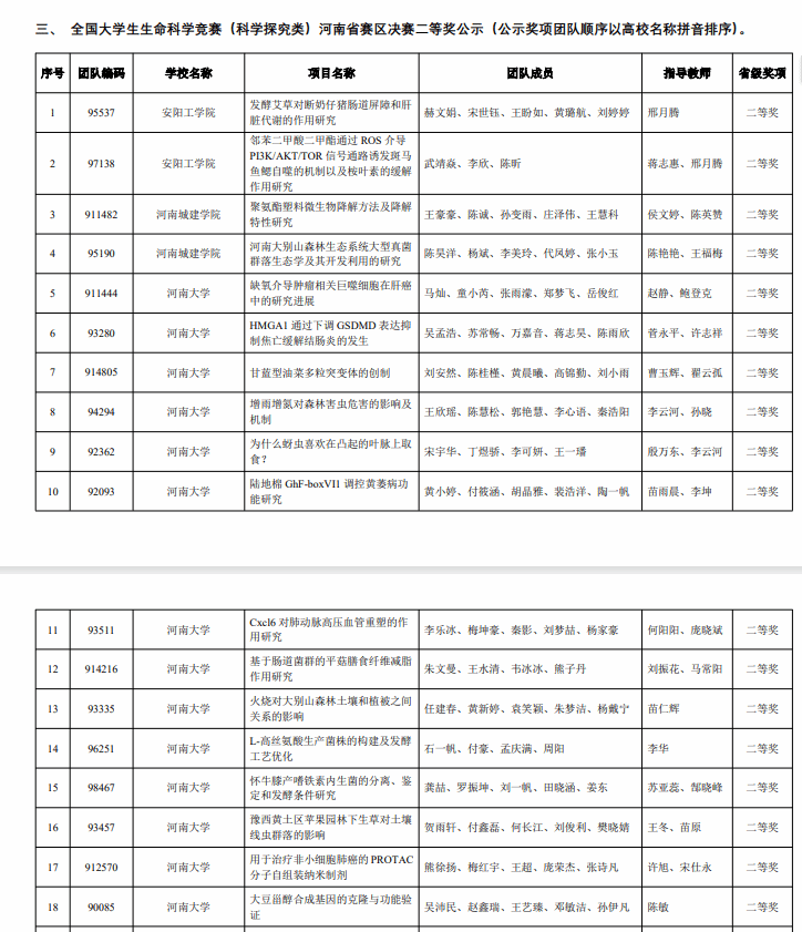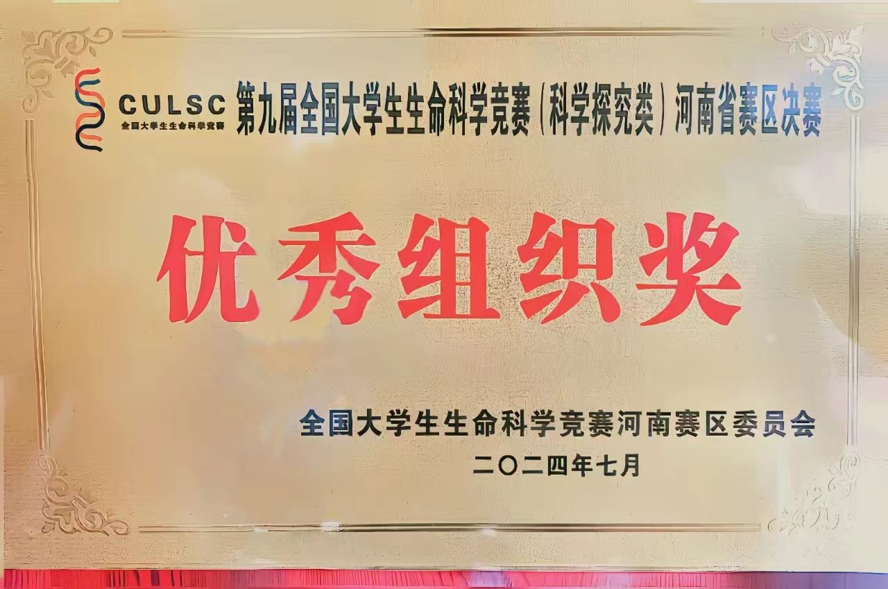 近日,全国大学生生命科学竞赛(2024,科学探究类)河南省赛区决赛在周口师范学院成功闭幕,比赛首次采取省赛、国赛二合一的方式进行。经过网络评审、参赛项目PPT展示、选手答辩、专家评审等环节,河南大学共荣获国家一等奖(省级特等奖)2项、国家二等奖(省级一等奖)4项、国家三等奖(省级二等奖)14项和省级三等奖17项,同时获优秀组织奖;上述奖项中,包含生命科学学院国家一等奖(省级特等奖)2项、国家二等奖(省级一等奖)2项、国家三等奖(省级二等奖)9项和省级三等奖11项。
