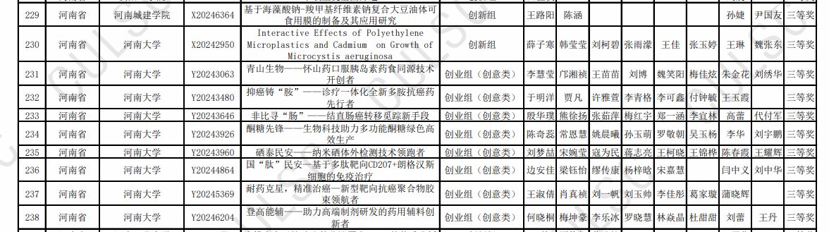 近日,全国大学生生命科学竞赛(2024,创新创业类)决赛在西华大学郫都校区成功举行。本届大赛共有来自全国535所高校的6676支团队参加,前期经过资格审查、网络评审、省赛等环节,共评选出484项参赛项目进入全国决赛。经过激烈角逐,河南大学获得一等奖2项,二等奖8项,三等奖9项,被授予优秀组织奖,其中生命科学学院共获得国家一等奖1项、二等奖4项、三等奖1项。