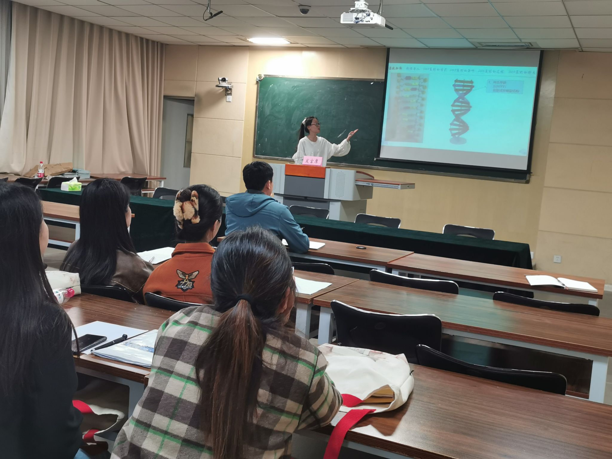 方城县第二初级中学贾金浩、濮阳经济技术开发区第二初级中学赵秀霞、埠江镇完全学校侯顺聚和固始县草庙一中张湘豫等学员分别以“传染病及其防治”“人体内废物的排出”“认识周边的生物”和“大单元教学的设计实施”等为题进行了教学展示和说课。2021级生物科学专业师范生王欣瑶同学进行了“DNA复制”章节的教学展示。参训学员对王欣瑶的教学素质给予了肯定,同时对其教学、板书设计等提出了改进建议。