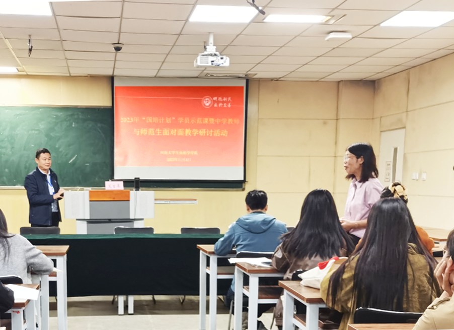 11月4日,“国培计划”学员示范课暨中学教师与师范生面对面教学研讨活动在生命科学学院B101教室顺利举行。生物科学系主任刘凌云、成教办主任李黎、生物科学系副主任肖保林以及学科教学教师张彤等观摩和点评示范课,河南大学“国培计划(2023)—农村骨干教师能力提升初中生物省级骨干教师”培训班全体学员和生物科学专业师范生代表参与活动,活动由肖保林主持。