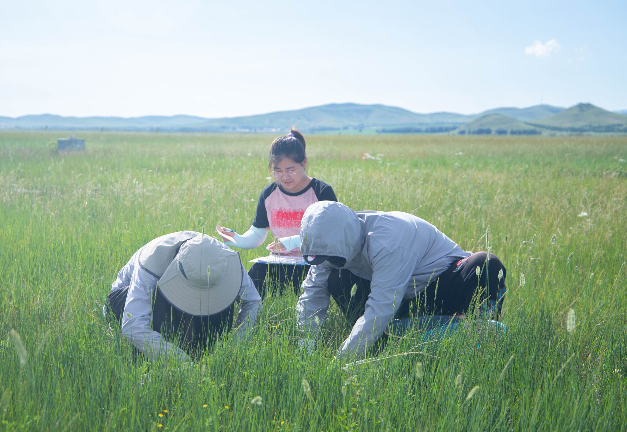 服务团依托中国科学院植物研究所恢复生态学研究站(多伦站)的核心科研平台(涵盖长期养分添加、刈割、全球变化多因子、降水控制及人工草地建植等实验体系),将专业知识转化为守护北疆生态屏障的实践力量。在站内科研人员的指导下,队员们深入草原腹地及实验样地,规范开展生态调查:设定样方、辨认植物、测量生物量;采集土壤样品、测定含水量;监测植被光合呼吸等关键指标。这些严谨获取的第一手数据,为理解草原生态系统响应、评估管理措施与修复技术效果提供了重要科学依据。队员们俯身草原、严谨求索的身影,正是“草原深处求真知”的生动写照,在国家级科研基地的磨砺中淬炼了青春担当。