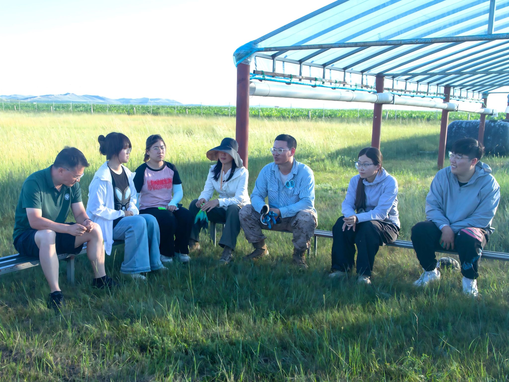 实践期间,学院老师时刻关注团队在蒙实践情况,7月11日,学院党委书记梁建忠一行抵达基地,在样田旁边举行别开生面的实践座谈会,详细询问了队员们在站的工作进展与生活状况,高度肯定同学们坚守科研一线的实践精神。在站期间,师生共同开展牧民走访和生态调研,为团队提供了强有力的支持。老师们特别提醒队员们,在多民族地区开展科研实践,需要时刻遵守民族风俗习惯,通过个人言行促进民族团结发展,主动与当地各族群众互帮互助、和睦相处。