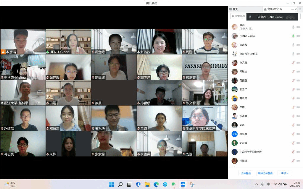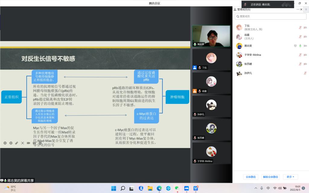 假期不停学,奋进不停歇。8月5日晚,2021级生物科学明德班召开了科技论文暑期线上分享会。学院党委书记、明德班班主任吴建伟,学院副院长、明德班副班主任李志芳,2021级辅导员张茜茜,明德班朋辈导师赵科举、于学荣、孟金艳、田露、茹艳霞和2021级明德班全体同学参加会议,会议由腾讯会议主会场和五个分会场组成,文体与心理委员唐滔主持会议。