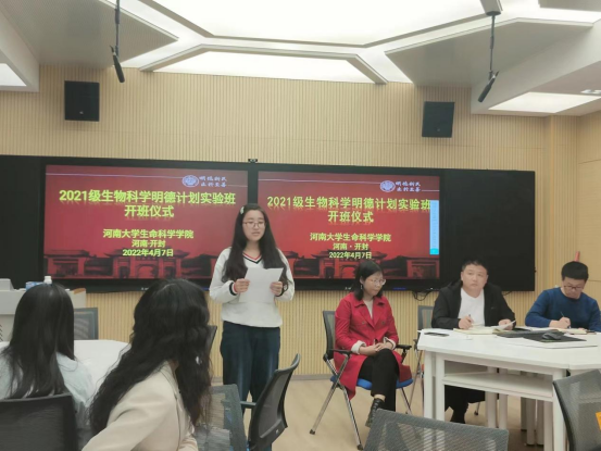 4月7日下午,2021级“生物科学明德计划实验班”开班仪式在学院智慧教室举行。该级所有班级成员,学院副院长赵海鹏、李志芳,教师代表陈敏教授,生物科学系主任刘凌云、教务办主任张要军、2021级辅导员张茜茜,2018级明德班优秀毕业生李晔等参加仪式,仪式由赵海鹏主持。