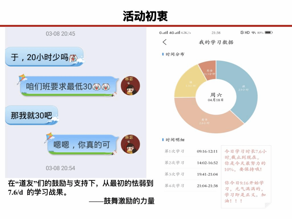 自“疫情当下,不负青春”学习督促计划活动开展七周以来,效果初显。团支书于学荣同学进行了阶段总结和优秀表彰,朱泽宇、刘学颖、李婉君、孟金艳、季雨欣、张佳等分别获得了“每周之星”“奋进摘月奖”和“最佳组织奖”,贯彻了“一个人可以走的很快,一群人才能走得更远”的活动初衷,让班级学习氛围日渐浓厚。