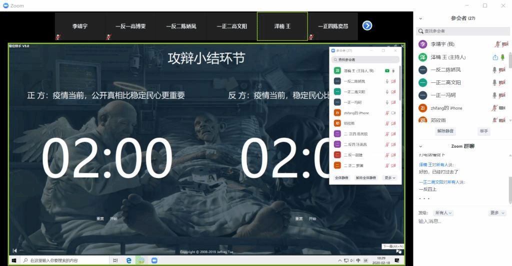 2020年2月18日上午10点,开云kaiyun网页版官网18级明德班利用Zoom平台,举办了“反思疫情,明德先行”线上辩论赛。围绕“新型冠状病毒的出现是好事还是坏事”和“公开疫情真相重要还是维持民心重要”两个论题展开激烈辩论。生命科学学院副院长赵海鹏、学院拔尖人才培养和国际交流办公室主任李志芳、2018级辅导员李靖宇担任比赛评委,王泽楠同学主持辩论会。
