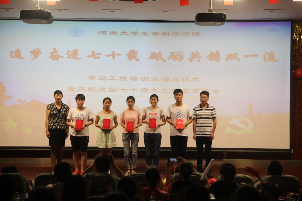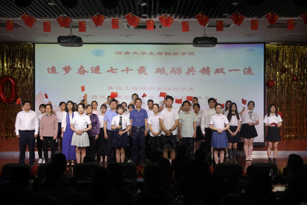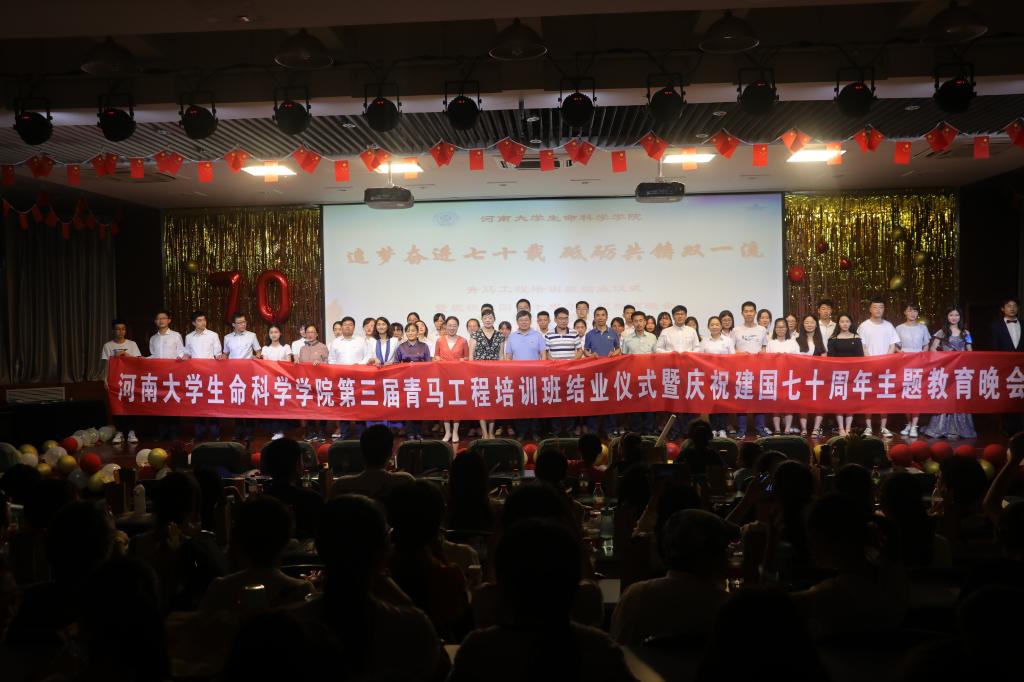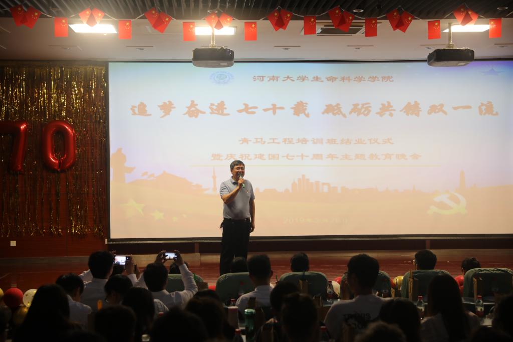 追梦奋进七十载,砥砺共铸双一流。5月26日晚,生命科学学院在圆形报告厅三楼举办青马工程培训班结业仪式暨“庆祝建国七十周年”主题教育晚会。河南大学党委宣传部副部长何威,河南大学党委学生工作部副部长、学生处副处长肖艳,生命科学学院党委书记赵东保、党委副书记张亚歌、副院长王道杰,学院外籍教师、法国南巴黎大学Michael DuBow 教授夫妇及其他教师代表莅临现场,近四百名本科生、研究生参加晚会。
