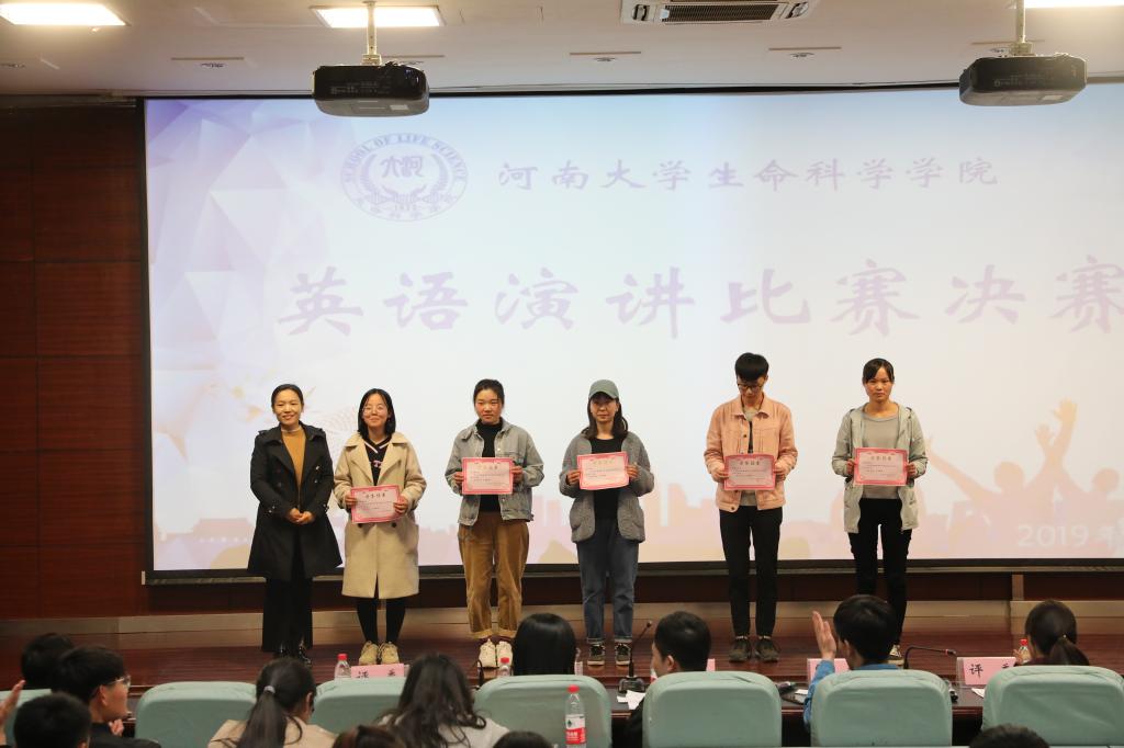 3月30日下午,生命科学学院在圆形报告厅三楼举办英语文化节系列活动之英语演讲比赛决赛。河南大学外语教研部李冬青老师、谢瑾老师,河南大学杰出人才特区支持计划特聘教授祝英方老师、生物工程系李志芳老师、生物科学系孙晓老师担任评委,院党办负责人、2018级辅导员李靖宇老师,院团委负责人、2017级辅导员王松廷老师莅临比赛现场,学院三百余名本科生观看本次决赛。