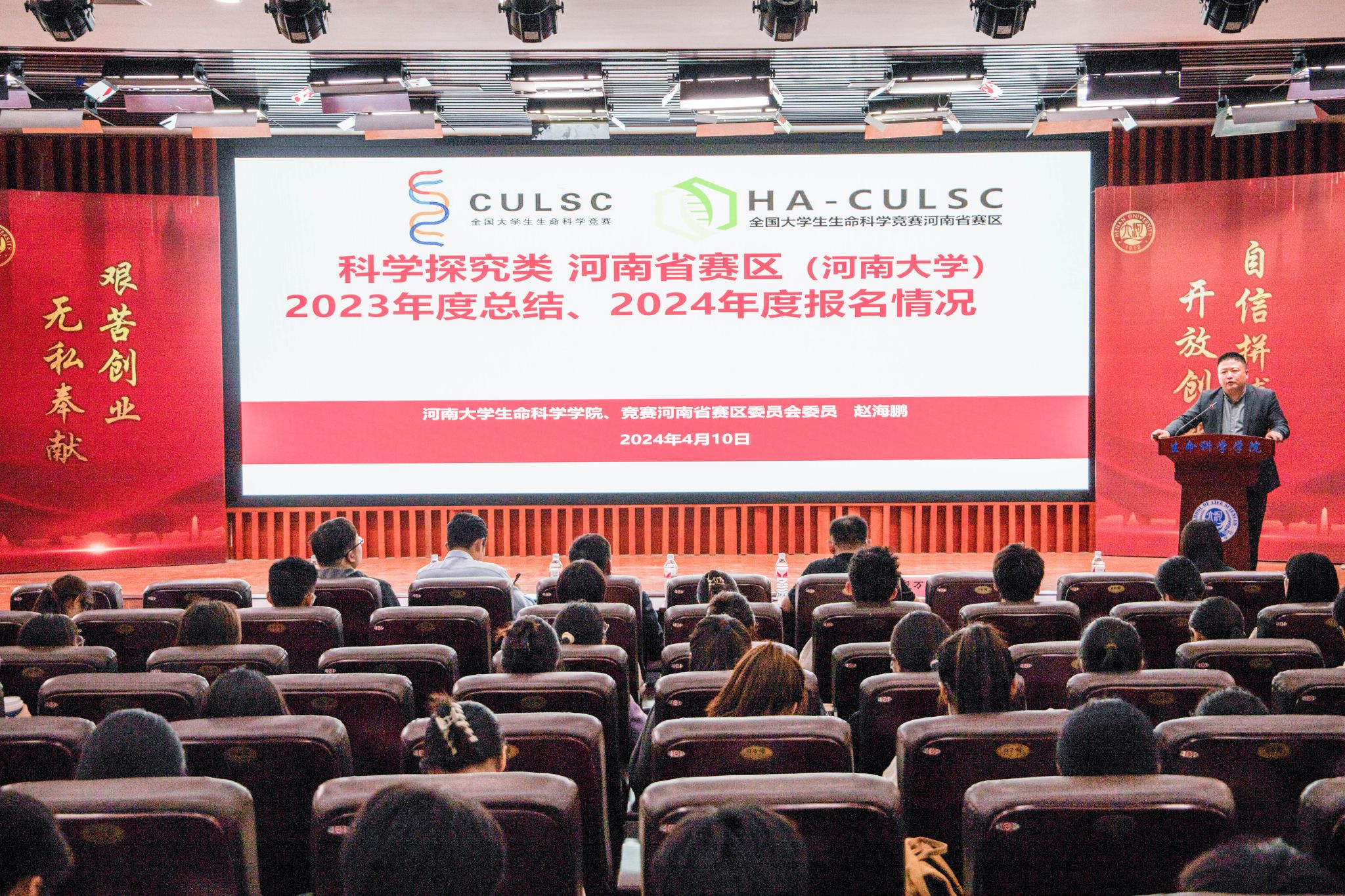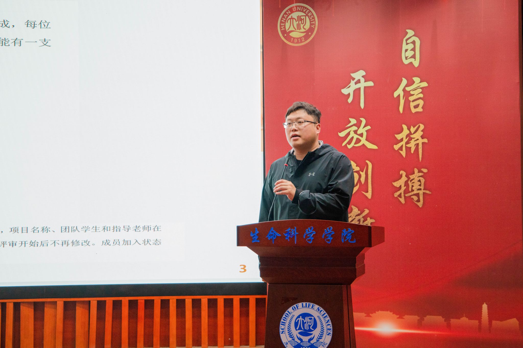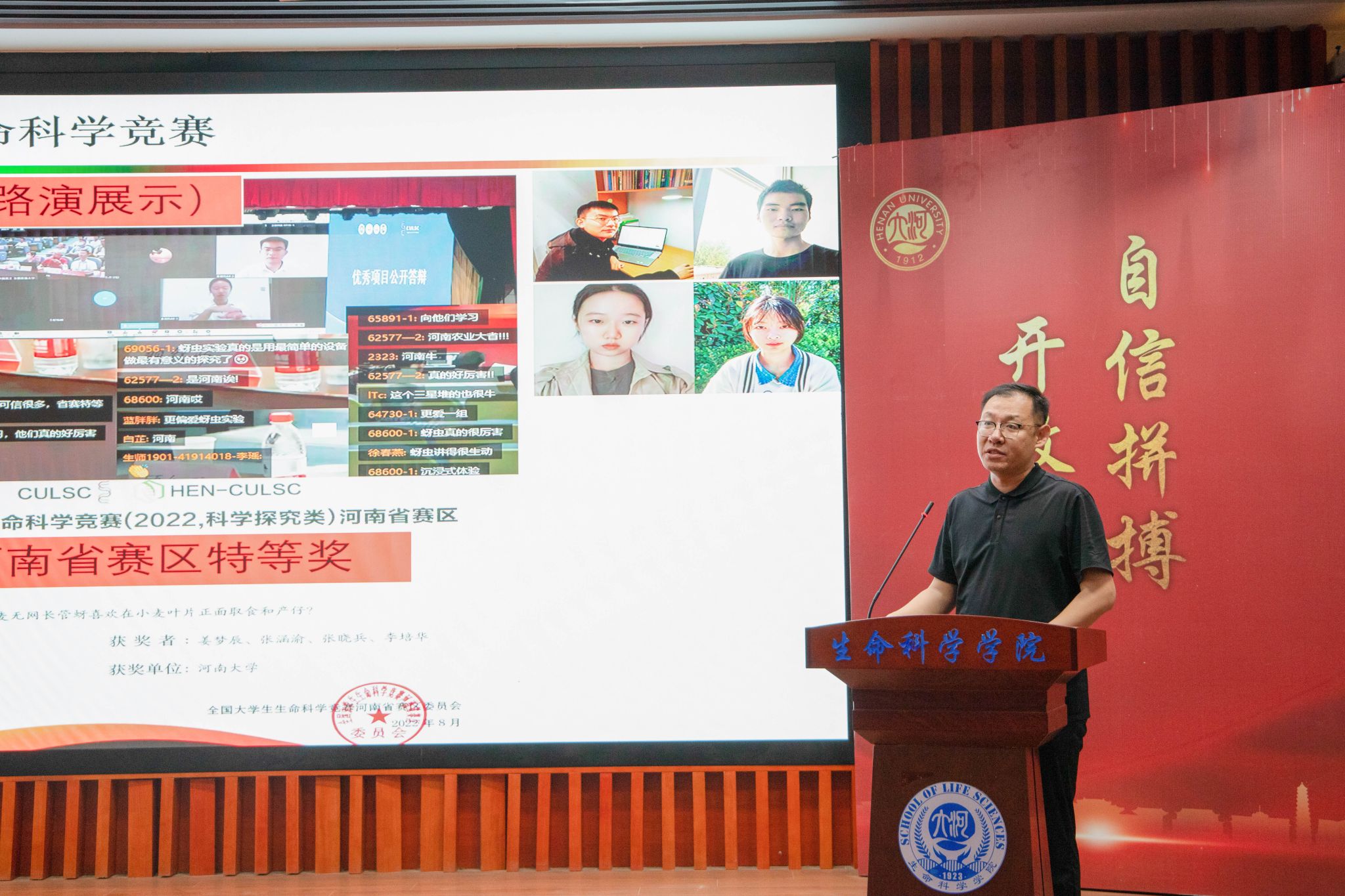 赵海鹏对全国大学生生命科学竞赛情况做了全面介绍,传达了3月底召开的全国大学生生命科学竞赛(科学探究类)河南省赛区委员会会议精神,介绍了竞赛组织的新动向。同时,强调了参赛纪律、学术规范,参赛要注重创新与合作,希望同学们着眼于科研本身,加强团队沟通交流,教学相长,共同提升参赛项目的水平和质量。