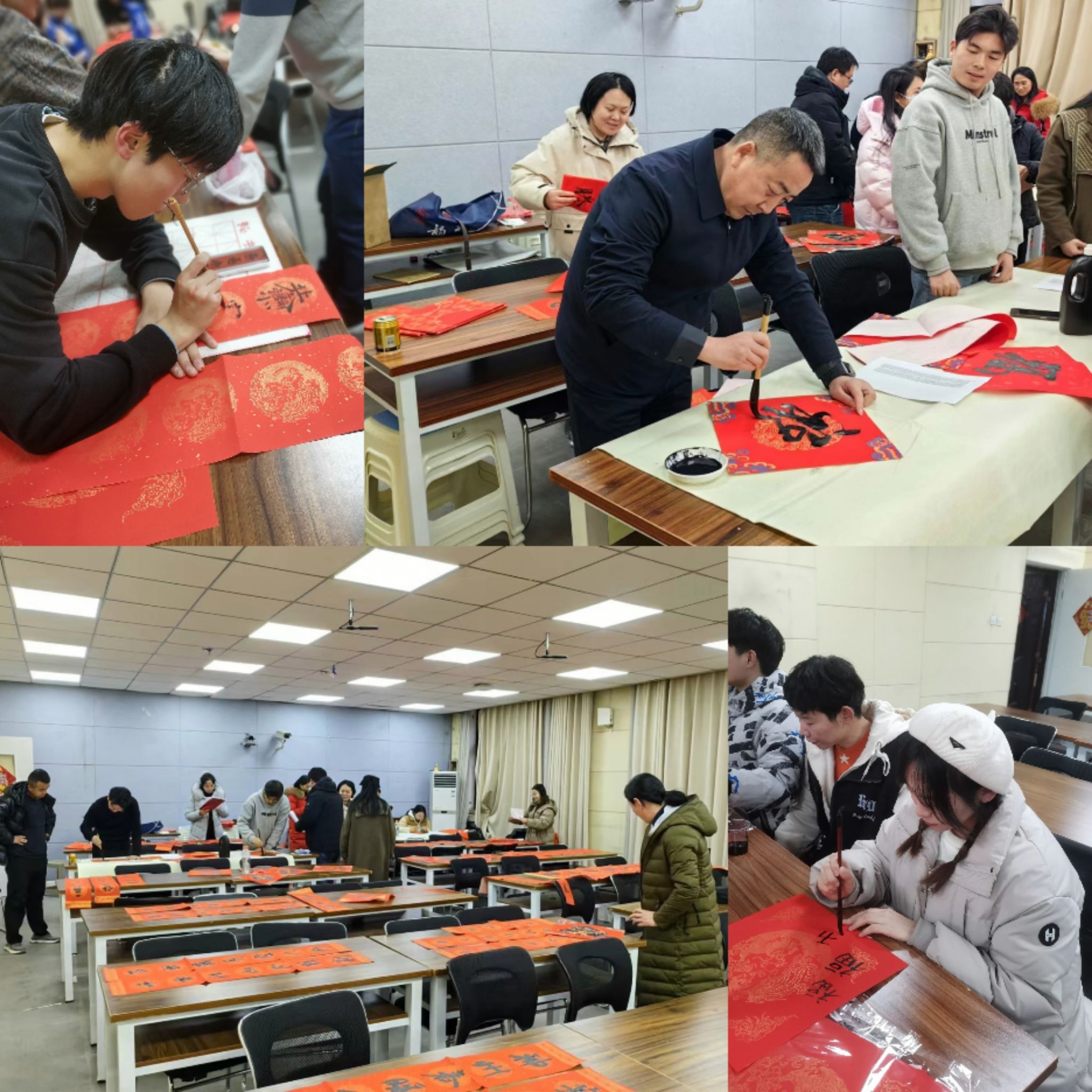 活动现场,师生挥毫泼墨、笔走龙蛇,镇纸、蘸墨、起笔一气呵成。“辰年迪吉千重瑞 龙岁呈祥四季宁”......浓浓的年味浓缩于一笔一划间,红底黑字的春联,似蛟龙出海,洋溢着中华民族特有的红色喜庆。一幅幅春联融入了师生对美好生活的向往,一个个带有“龙”样的福字寄托着平安、喜乐的祝愿。大家一边欣赏书法,一边品味春联予以,领略传统文化的魅力。