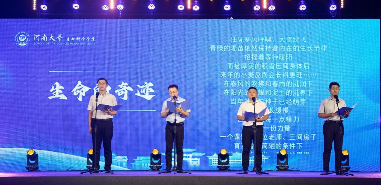 罗雅倩、方莫扉、王欣瑶等同学带来舞蹈串烧《交织》,多种舞蹈风格相互交织、碰撞,充分展现出多元文化融合的独特魅力。学院党委副书记宋永鹏,副院长赵海鹏、李国勇、赵昕鹏共同带来了朗诵《生命的奇迹》,他们用真挚的情感、激昂的语调,礼赞河南大学生物学科的伟大与奇迹,将晚会推向了高潮。赵风齐、冯自创带来豫剧《朝阳沟-双上山》,他们唱腔婉转悠扬,身段优美灵动,尽显传统戏曲魅力。晚会上,武术学院带来的武术表演《阴阳合武·韵千秋》赢得全场经久不息的掌声,他们身姿矫健,动作刚柔并济,充分展现出武术的阳刚之美。师生们带来古典舞《伊人》,用优美的舞姿、细腻的情感再绘古典之美,让观众们在欣赏中领略到古典艺术的永恒魅力。