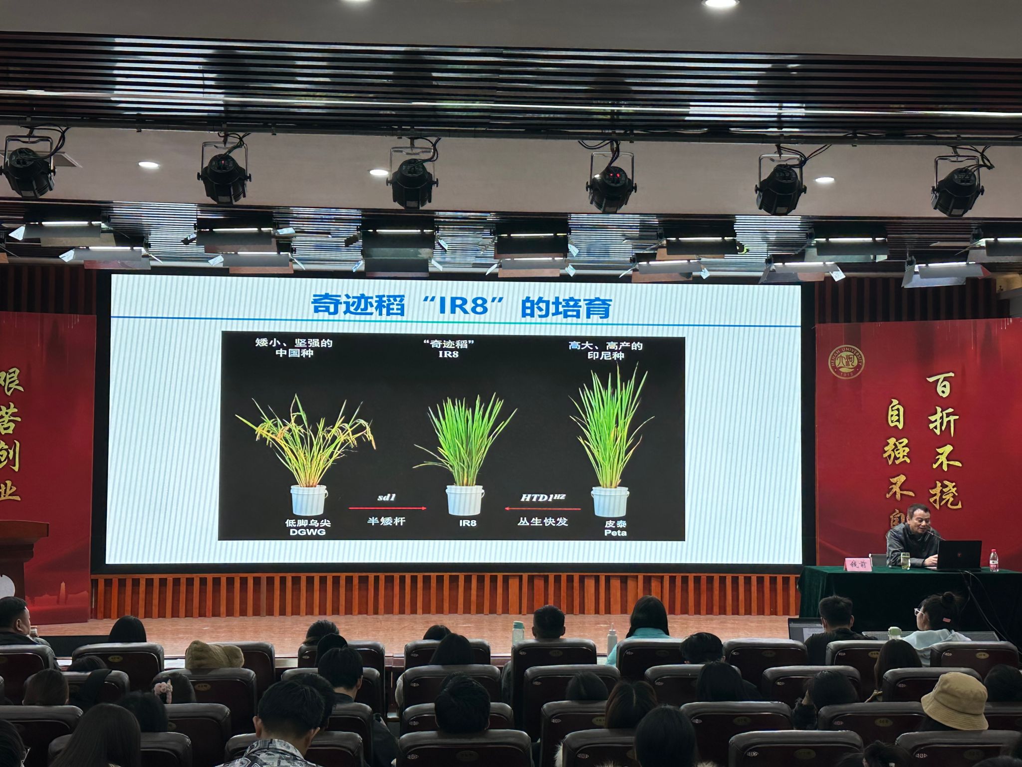 钱前院士以籼型杂交水稻问世距今恰逢50周年为引,以三次“绿色革命”时间轴回顾了杂交水稻的研究历程。水稻乃“国之重器”,是增加国家粮食产量、消除国家粮食问题、保障国家粮食安全的制胜法宝。他指出,我国水稻高产育种能力已位居世界领先地位,得益于袁隆平院士、张先程教授等一大批科学家前赴后继,在世界范围内掀起杂交水稻研究热潮,为中国人彻底解决饥饿的同时也为世界粮食增产做出了巨大贡献。钱前院士始终保持着水稻育种的浓厚兴趣,通过讲述自己的成长历程、求学经历,勉励当代青年学生要始终坚信“天生我材必有用”,做到“知其然,知其所以然”,继承和弘扬科学家精神,在实践中不断积累,敢想敢干、守正创新。