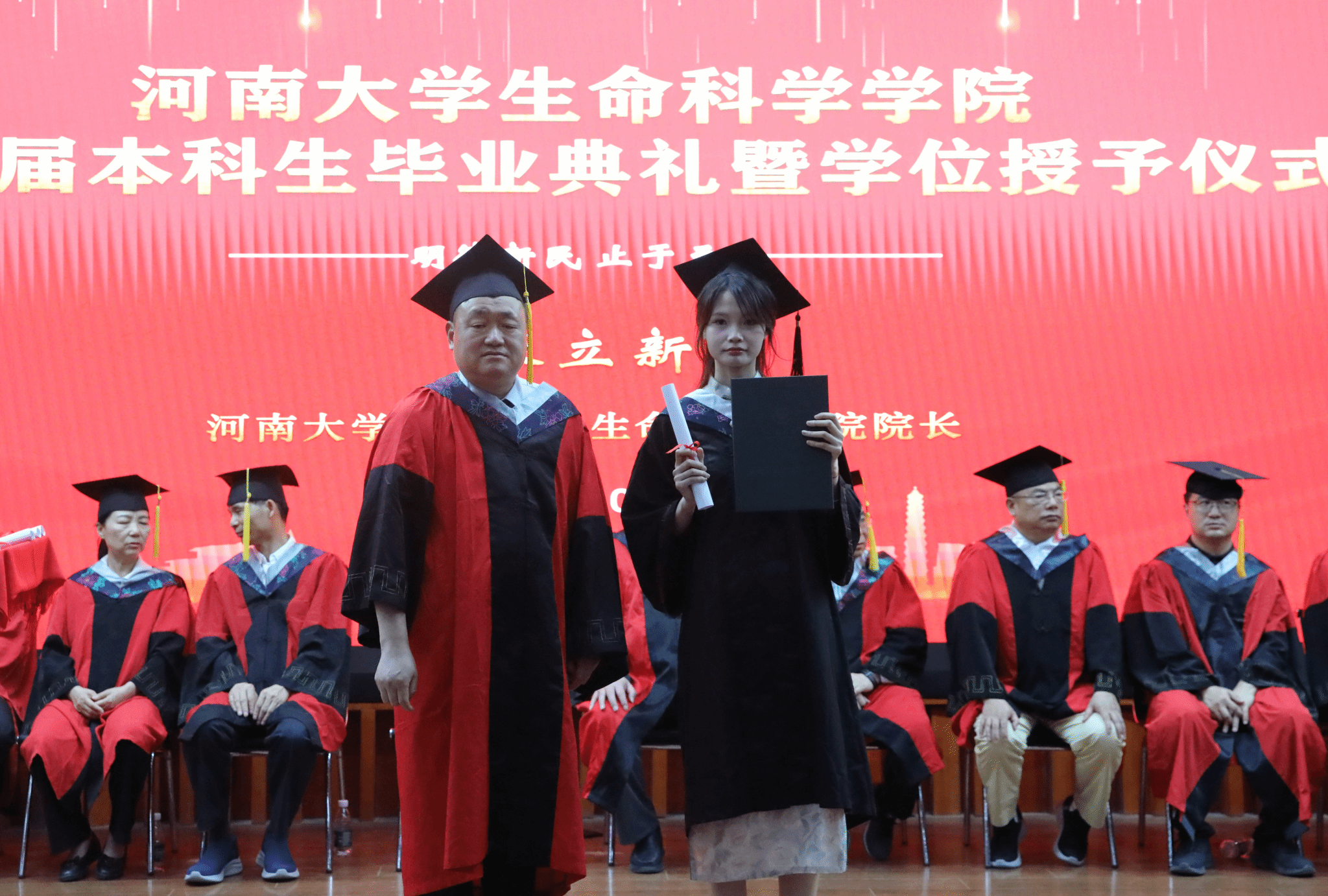 副校长、生命科学学院院长张立新为毕业生颁发学士学位证书、援正流苏,并合影留念。庄重的仪式、灿烂的笑容、热烈的掌声交织在一起,构成了一幅无比激动人心的画面。