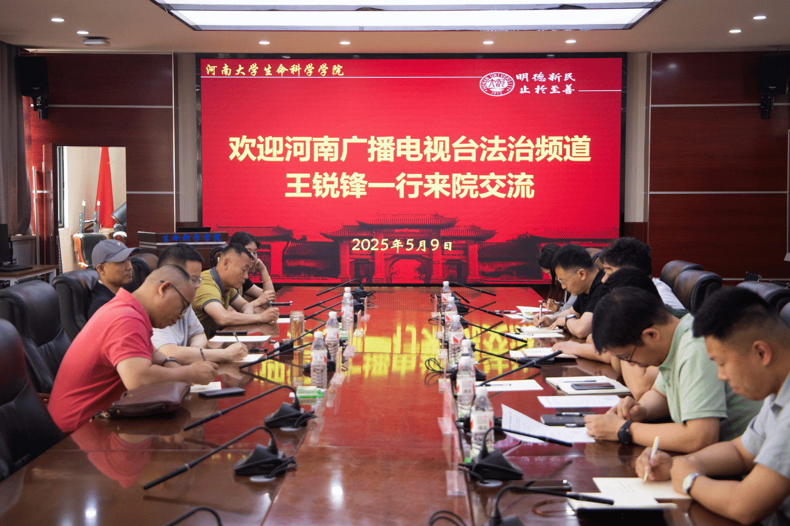 为进一步加强校媒合作,深化科学传播与法治宣传的融合发展,5月9日,河南广播电视台法治频道副总监王锐锋、新媒体主管罗丁元、新媒体中心副主管李怀龙一行来院交流。学院党委书记梁建忠,副书记宋永鹏,副院长李国勇、赵昕鹏,党办主任张丽、学院团委负责人宋晓峰参与座谈。