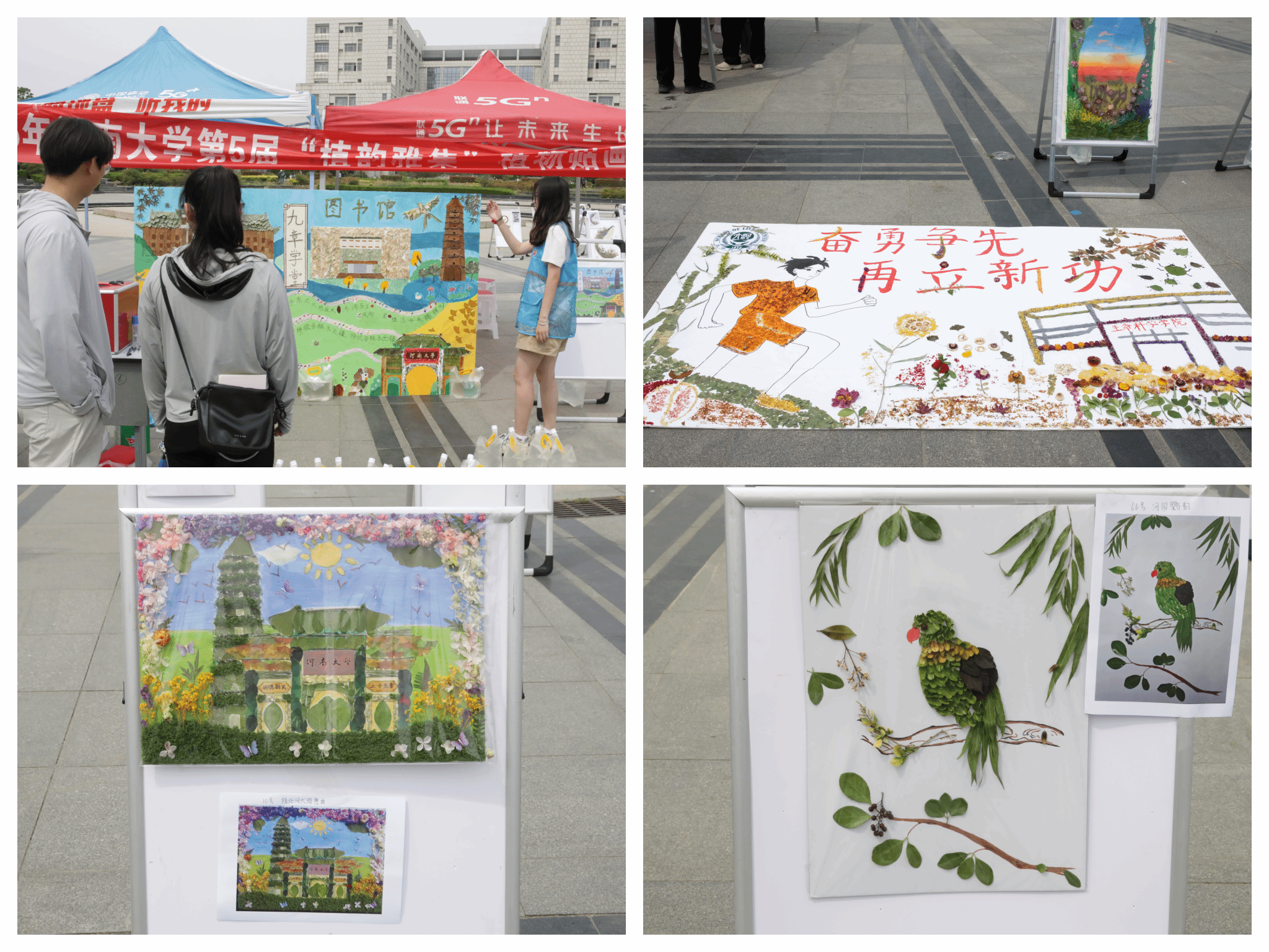 在创作过程中,65支参赛选手们穿梭于校园的各个角落,精心挑选植物材料,巧妙构思、精心制作,将自然之美与艺术创作完美融合,创作出了一幅幅主题鲜明、创意独特、色彩斑斓的植物贴画作品。这些作品或以河南大学的标志性建筑与文化景观为蓝本,展现河南大学深厚的文化底蕴与独特的自然风貌;或描绘动物世界,用植物的纹理与色彩勾勒出栩栩如生的动物形象;或聚焦专业特色,展现“奋勇争先、再立新功”的时代图景。