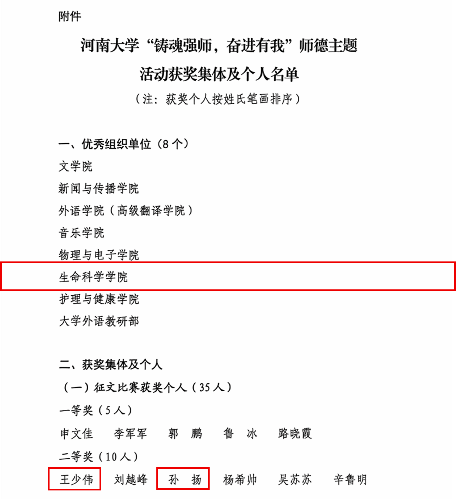 在师德主题征文比赛中,教师王少伟、孙扬结合教育实践,以深刻思考和真挚情感获得个人二等奖。王少伟在演讲比赛中凭借育人故事和情感表达能力,荣获个人二等奖。生命科学学院在优秀工作案例评选中表现突出,成为全校唯一获评二等奖的集体,充分彰显了学院师德建设工作的显著成效。