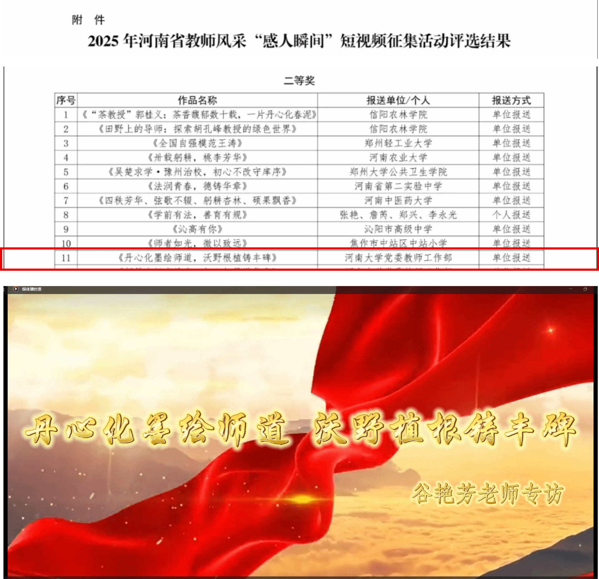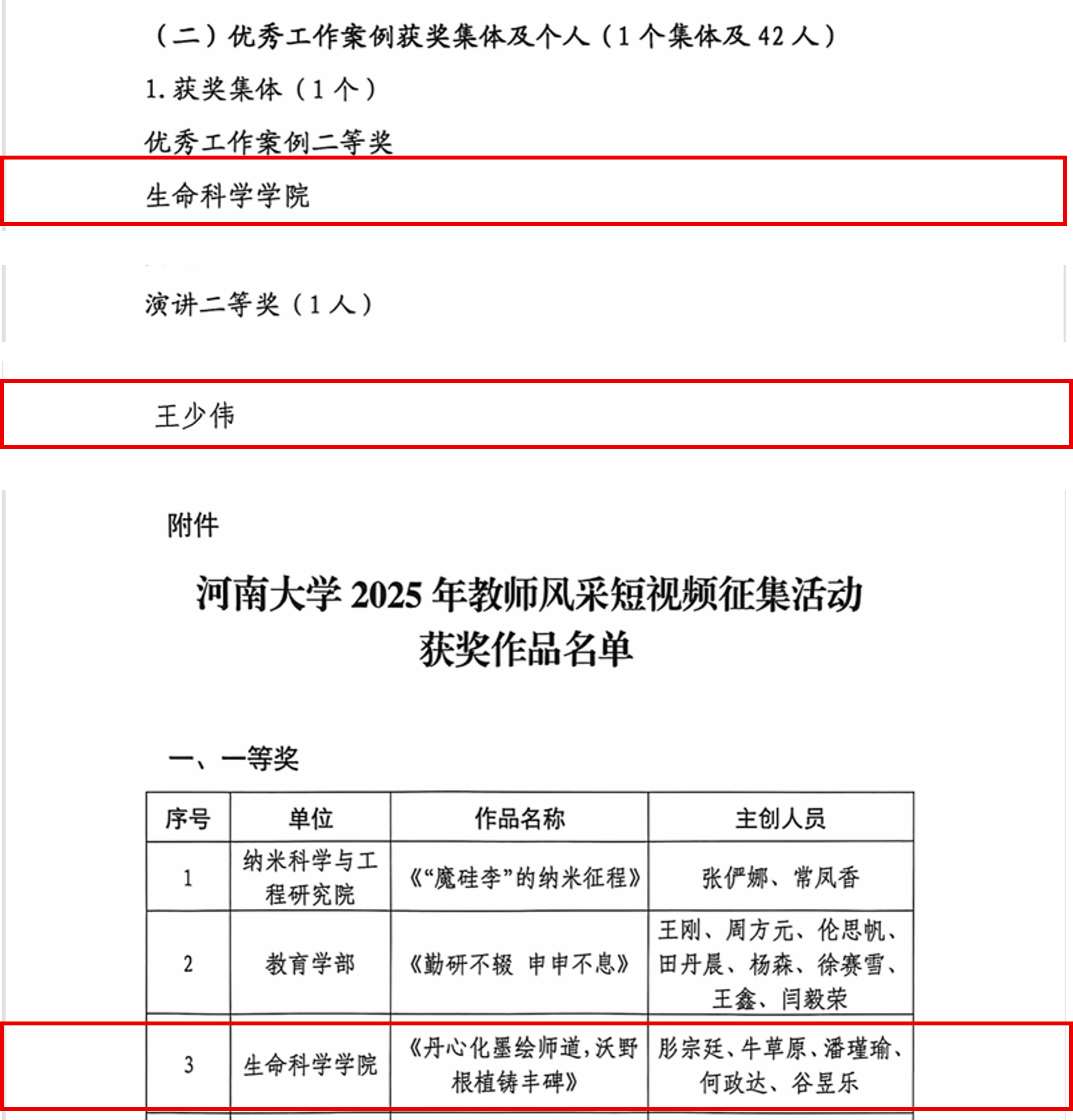 为深入贯彻落实新时代师德师风建设要求,生命科学学院扎实推进新时代师德师风建设,在“铸魂强师,奋进有我”师德主题活动,荣获河南大学“优秀组织单位”称号,并获得优秀工作案例集体二等奖1项、主题征文比赛个人二等奖2项、演讲比赛个人二等奖1项、教师风采短视频征集活动校级一等奖1项。其中,在“感人瞬间”教师风采短视频征集活动中,学院推荐的作品《丹心化墨绘师道,沃野根植铸丰碑》获河南省二等奖。