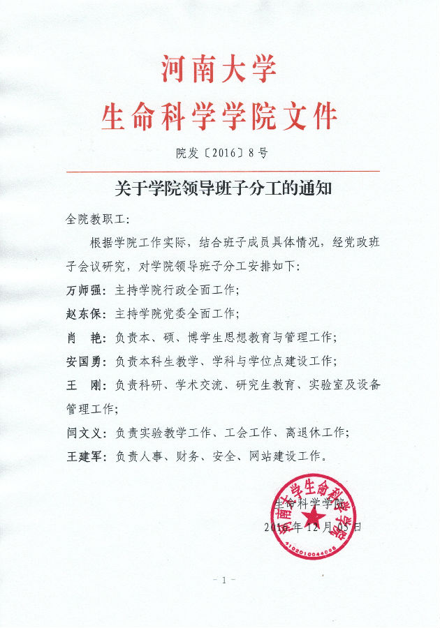 关于学院领导班子分工的通知