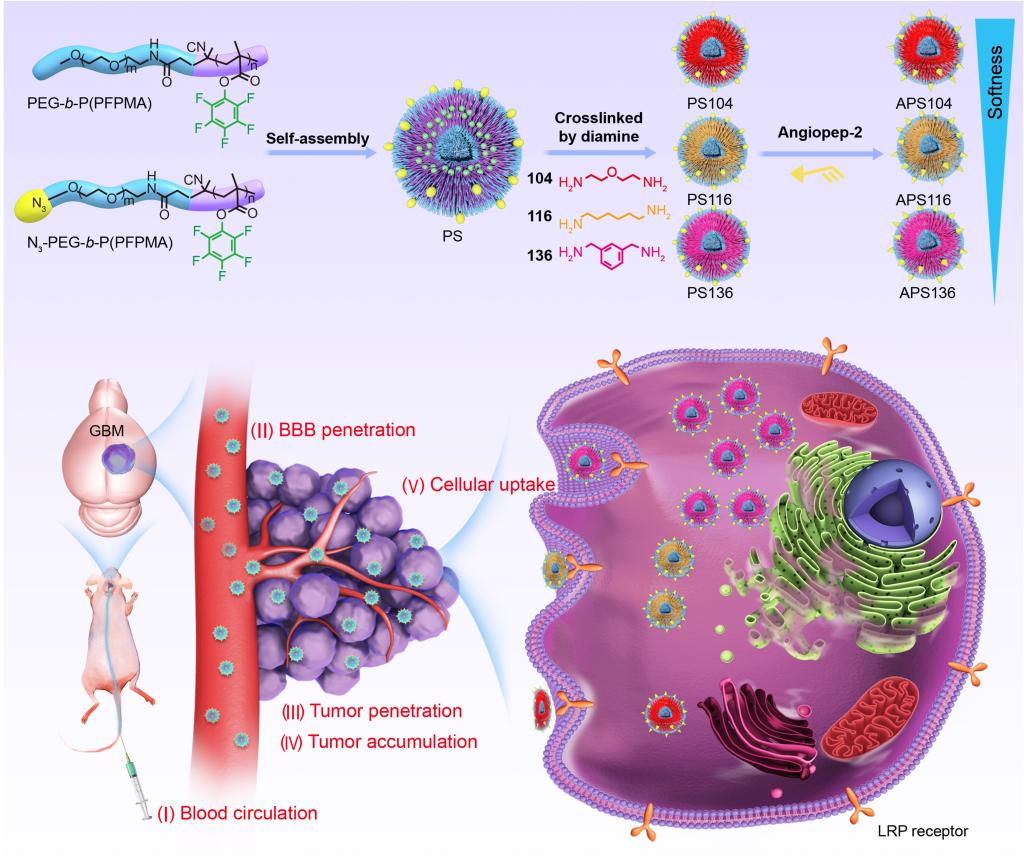 研究人员首先利用不同的交联剂对两嵌段聚合物PEG-P(PFPMA)自组装形成的囊泡疏水中间层进行交联。在不改变囊泡结构的条件下,获得一组大小、电荷相同的高分子囊泡。因囊泡内部交联剂的不同,表现出不同的弹性。研究人员通过动态学模拟计算证明,高分子囊泡的弹性与交联剂的刚性密切相关。最后,在囊泡表面修饰脑肿瘤靶向肽,比较不同弹性高分子囊泡的脑肿瘤靶向能力。