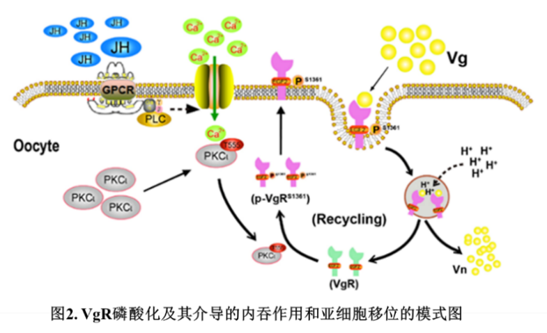 在许多昆虫中,卵黄原蛋白的合成、运输和VgR介导的内吞作用由倍半萜类的保幼激素调控。保幼激素是昆虫最重要的内分泌激素之一,不但抑制昆虫从幼虫到蛹到成虫的变态,也促进成虫生殖过程的卵黄生成和卵成熟。周树堂教授团队以蝗虫为模式,利用磷酸化蛋白质组学、液相色谱质谱和药理学分析,在VgR的第二个表皮生长因子前体同源结构域中鉴定到丝氨酸磷酸化位点Serine1361,发现保幼激素通过GPCR‒PLC‒PKCι信号通路诱导VgR在Serine1361磷酸化。借助遗传学、分子生物学和细胞生物学的方法,发现只有在Serine1361磷酸化状态下,VgR才能在卵母细胞膜上与卵黄原蛋白结合,进而通过内吞作用进入卵母细胞内。卵母细胞中内体的高酸性条件诱导VgR去磷酸化,去磷酸化的VgR与卵黄原蛋白分离,使卵黄原蛋白以卵黄形式储存于卵内,而VgR被PKCι磷酸化后返回到卵母细胞膜表面。进一步通过对棉铃虫、美洲大蠊等其它昆虫的研究,发现VgR磷酸化及其介导的内吞作用和亚细胞循环在进化上高度保守。