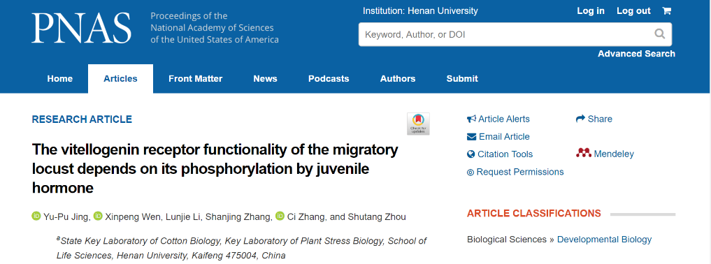 近日,《美国科学院院刊》(PNAS)在线发表了周树堂教授团队题为“The vitellogenin receptor functionality of the migratory locust depends on its phosphorylation by juvenile hormone”的研究论文(doi:10.1073/pnas.2106908118)。该文通过对蝗虫、棉铃虫和美洲大蠊的研究,揭示了保幼激素通过包括G蛋白偶联受体(GPCR)、磷脂酶C(PLC)和蛋白激酶C iota(PKCι)在内的信号通路,诱导卵黄原蛋白受体(VgR)磷酸化,进而调控受体介导的内吞作用以及VgR从卵母细胞内向膜上迁移的分子机制。