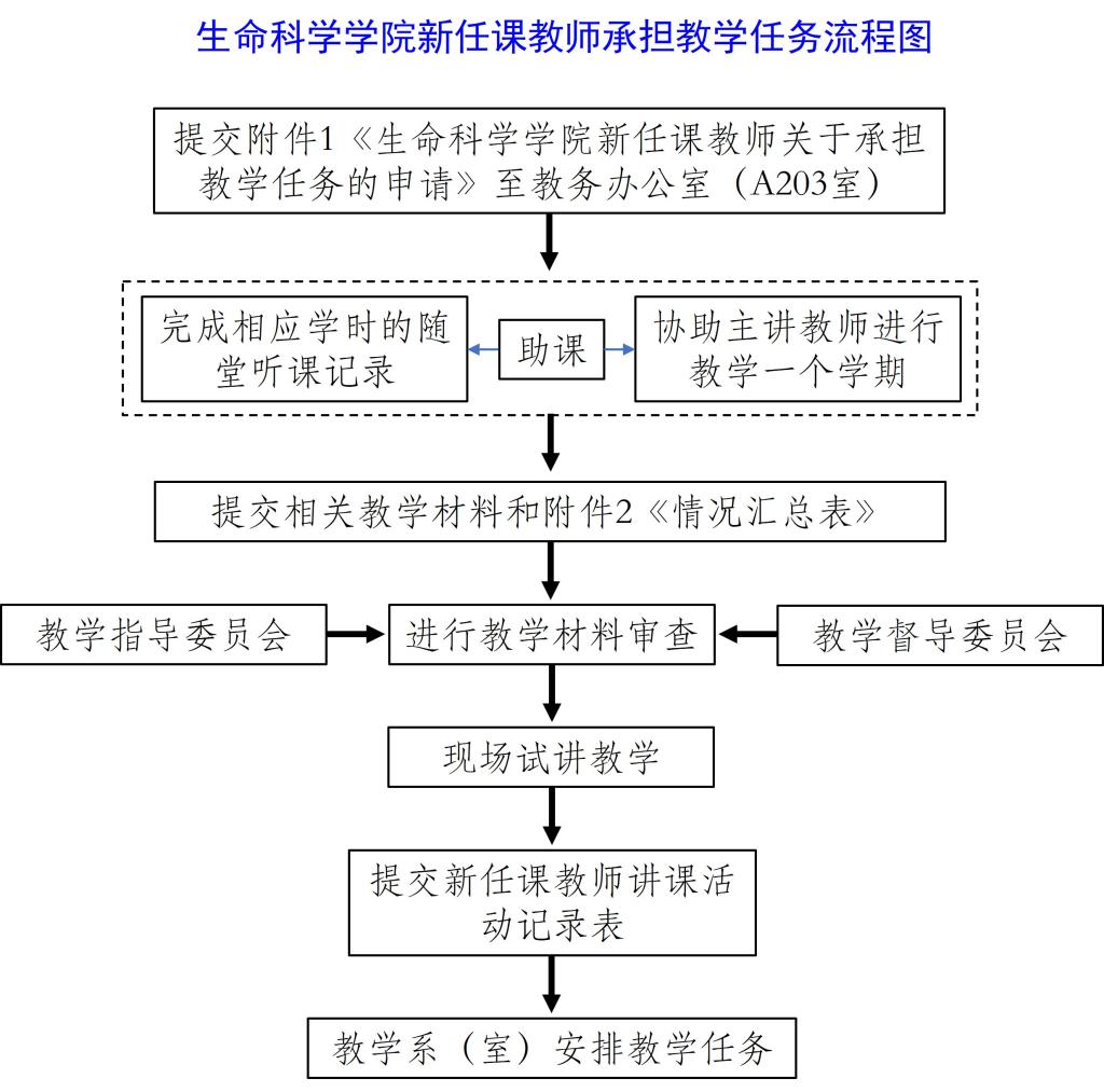 1、申请新任课教师将附件1《生命科学学院新任课教师关于承担教学任务的申请》提交学院教务办公室(学院A203室)。